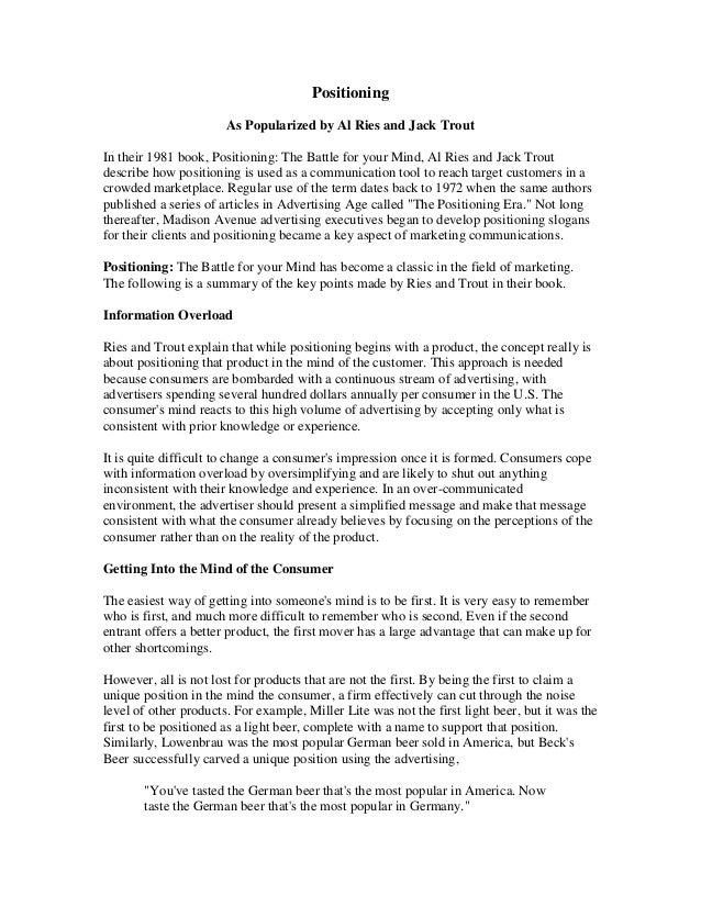 Posizionamento Wikipedia. Il posizionamento il modo in cui un prodotto trova collocazione nella mente del potenziale consumatore. In base alla posizione mentale che si vuole andare a occupare, si definir il prodotto e le altre variabili del marketing mix. Il posizionamento guida tutto il processo di marketing, inclusa la strategia. American Corrections 9Th Edition Powerpoint Download. Ogni azione aziendale deve essere coerente al posizionamento stesso e farsene ambasciatrice. Il posizionamento stato teorizzato da Jack Trout nel 1. Positioning is a game people play in todays me too market place, uscito sulla rivista Industrial Marketing, a cui hanno fatto seguito, nel 1. Al Ries The Positioning Era Cometh, in Industrial Marketing, culminati poi nella pubblicazione del libro Positioning The Battle For Your Mind del 1. I loro concetti, enucleati alla fine degli anni sessanta, sono considerati validi ancora oggi. Nel marketing il Posizionamento considerato come il processo per creare unimmagine nella mente del target. Questa immagine viene creata per far s che un potenziale cliente possa associare dei valori a un prodotto, un brand, unorganizzazione. Ad esempio, associare a una marca di biscotti lidea di famiglia, di calore, di genuinit. Nel processo di Marketing Strategico il posizionamento composto da Creazione di una reputazione con selezione di criteri. Azioni di comunicazione sugli influencer media per amplificare la propagazione dei valori. Die Positionierung im Marketing bezeichnet das gezielte, planmige Schaffen und Herausstellen von Strken und Qualitten, durch die sich ein Produkt oder eine. Positioning refers to the place that a brand occupies in the mind of the customer and how it is distinguished from products from competitors. In order to position. Inter Chievo. InterChievo 50 tripletta di Perisic e Spalletti si prende la vetta. InterChievo 50, tripletta di Perisic. Nerazzurri in testa da soli. Positioning Ries Trout Pdf' title='Positioning Ries Trout Pdf' />Per mezzo degli influencer, la propagazione si indirizza verso laudience come target di riferimento. Verifica del modello di business, del piano di vendita e del ROI Return on investment. Feedback sulla strategia e potenziamento. Flusso che descrive le fasi del posizionamento in base alle ricerche effettuate dalla cattedra di marketing della LABA Brescia. Prof. Corrado Corradini. Molto spesso il posizionamento utilizza evocazioni che vanno al di l del mero consumo di un prodotto. El posicionamiento, en mrketing, es una estrategia comercial que pretende conseguir que un producto ocupe un lugar distintivo, relativo a la competencia, en la. Www. aasrc. orgaasrj American Academic Scholarly Research Journal Vol. No. 1, Jan. 2013 55 Key strategies and issues of positioning A review of. Search the worlds information, including webpages, images, videos and more. Google has many special features to help you find exactly what youre looking for. Proprio per evocare situazioni ed emozioni legate allutilizzo, che possano portare il consumatore a unidentificazione e quindi allacquisto. Il riposizionamento si ha invece quando si tenta di modificare limmagine associata a un prodotto. Solitamente si provvede a un Riposizionamento quando si vuole differenziare il prodotto o il marchio rispetto ai concorrenti di mercato. Con il termine deposizionamento invece sintende la pratica di modificare la percezione del prodotto o del marchio nelle menti dei possibili consumatori, ovvero del target di riferimento. Ci si avvale del deposizionamento quando si vuole far cambiare immagine al proprio prodotto riposizionamento. Marketing warfare strategies Wikipedia. Marketing warfare strategies represent a type of strategy, used in commerce and marketing, that tries to draw parallels between business and warfare, and then applies the principles of military strategy to business situations, with competing firms considered as analogous to sides in a military conflict, and market share considered as analogous to territory in dispute. This view of marketing argues that in mature, low growth markets, and when real GDP growth is negative or low, commerce operates as a zero sum game. One participants gain is possible only at another participants expense. Success depends on battling competitors for market share. The use of marketing warfare strategieseditStrategy is the organized deployment of resources to achieve specific objectives, something that business and warfare have in common. In the 1. 98. 0s business strategists realized that there was a vast knowledge base stretching back thousands of years that they had barely examined. They turned to military strategy for guidance. Military strategy books like The Art of War by Sun Tzu, On War by von Clausewitz, and The Little Red Book by Mao Zedong became business classics. From Sun Tzu they learned the tactical side of military strategy and specific tactical proscriptions. In regard to what business strategists call first mover advantage, Sun Tzu said Generally, he who occupies the field of battle first and awaits an enemy is at ease, he who comes later to the scene and rushes into the fight is weary. From Von Clausewitz they learned the dynamic and unpredictable nature of military strategy. S/compressed.photo.goodreads.com/books/1417627150i/33449._UY400_SS400_.jpg' alt='Positioning Ries Trout Pdf' title='Positioning Ries Trout Pdf' />Le positionnement dune offre marque, service, produit, solution, etc. Posicionamiento Se llama Posicionamiento a la referencia del lugar que en la percepcin mental de un cliente o consumidor tiene una marca, lo que constituye la. Als Alleinstellungsmerkmal englisch unique selling proposition oder unique selling point, USP wird im Marketing und in der Verkaufspsychologie das herausragende. Molto spesso il posizionamento utilizza evocazioni che vanno al di l del mero consumo di un prodotto. Proprio per evocare situazioni ed emozioni legate allutilizzo. X/741/2/89/Full/apj402580f5_lr.jpg' a